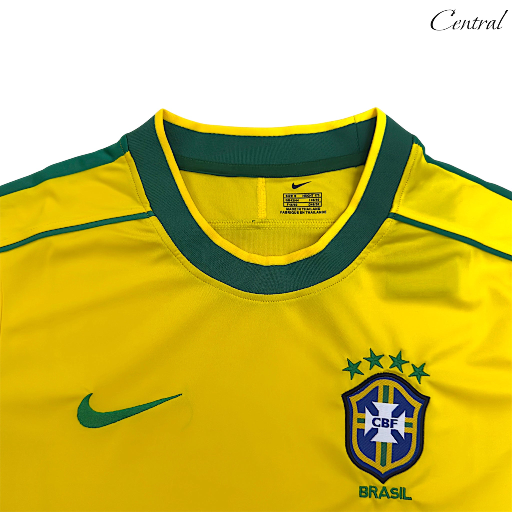 Brazil 1998 Home Retro Jersey by Central Ae featuring vibrant yellow fabric with green accents and classic team logo.