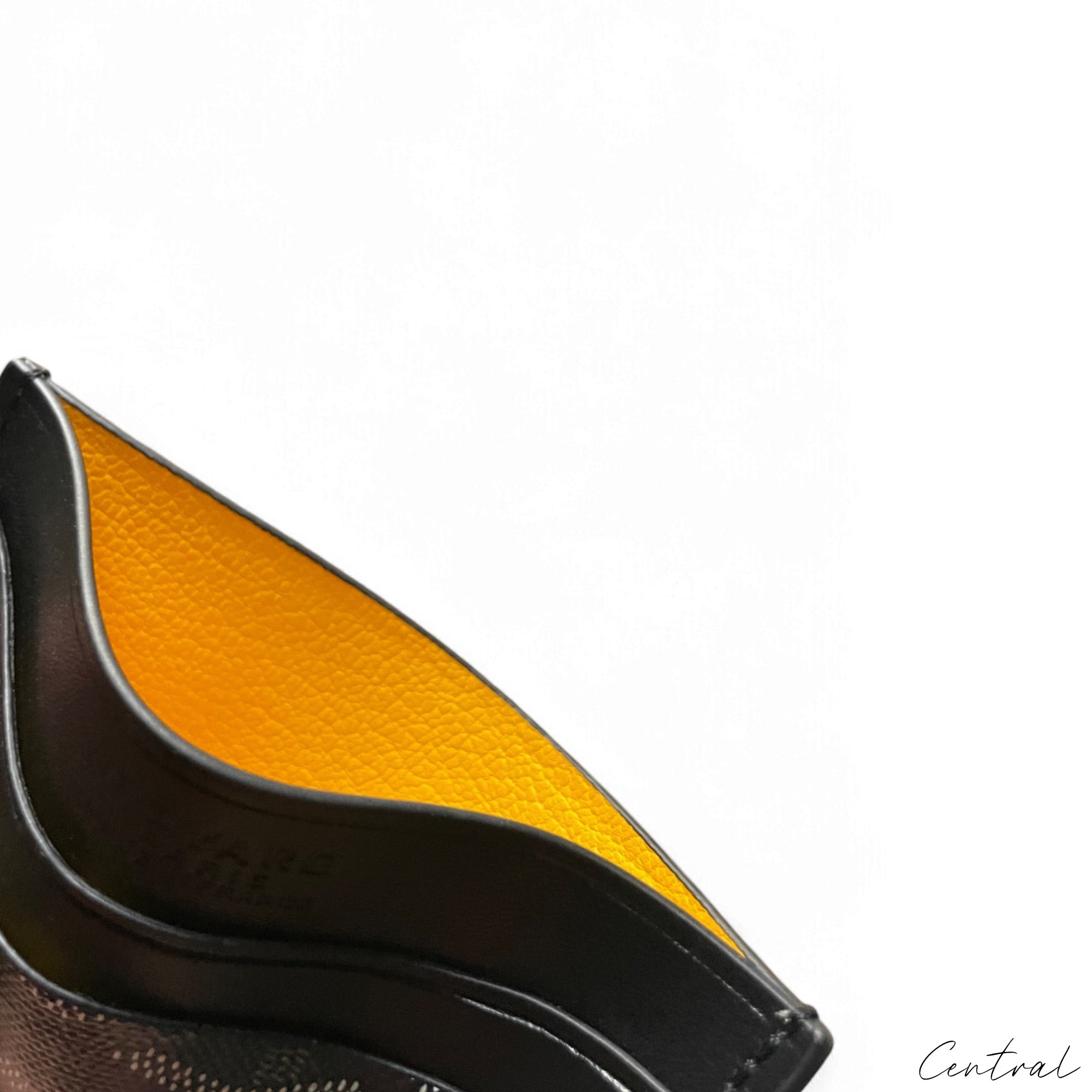 Black Goyard card holder by Central ae, featuring a sleek design and the iconic Goyard pattern.
