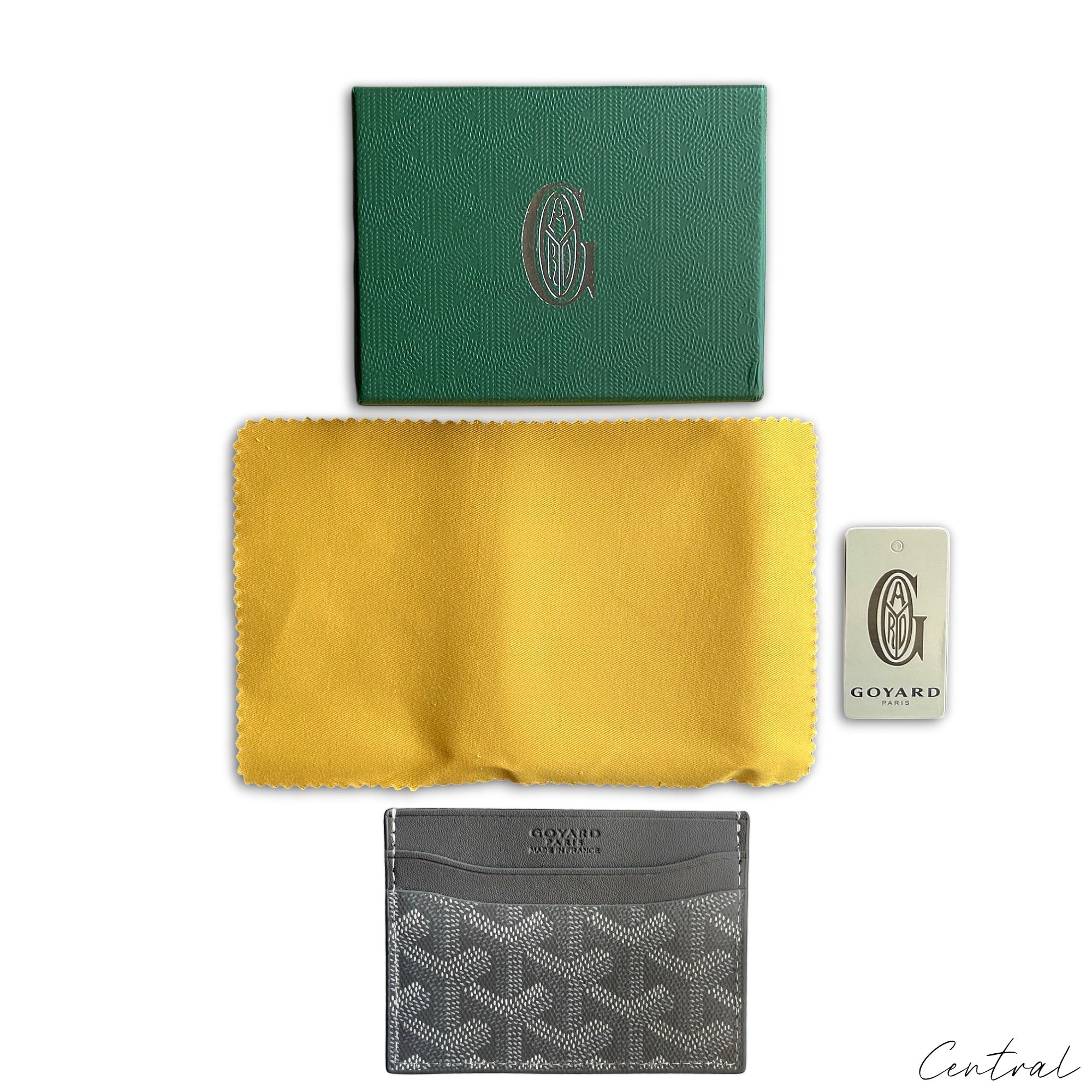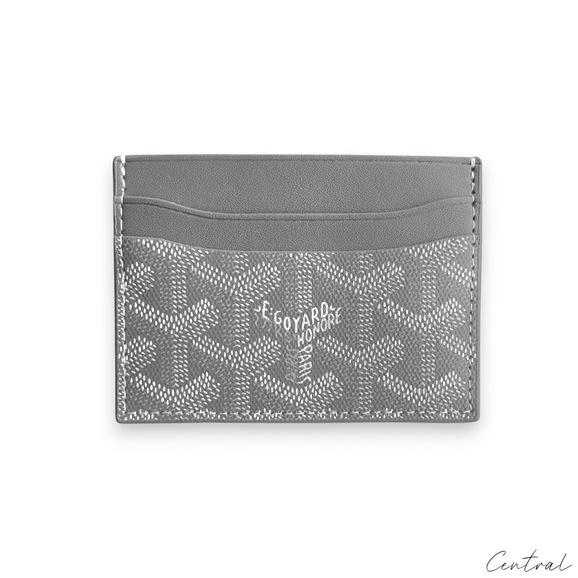 Gray Goyard card holder featuring the brand's signature pattern and sleek design, displayed on a neutral background. Gray Goyard card holder featuring a sleek design and signature pattern, perfect for organizing cards. Gray Goyard card holder from Central ae featuring a sleek design and classic logo pattern, perfect for organizing cards. Gray Goyard card holder featuring signature pattern and sleek design, ideal for carrying credit cards and IDs.