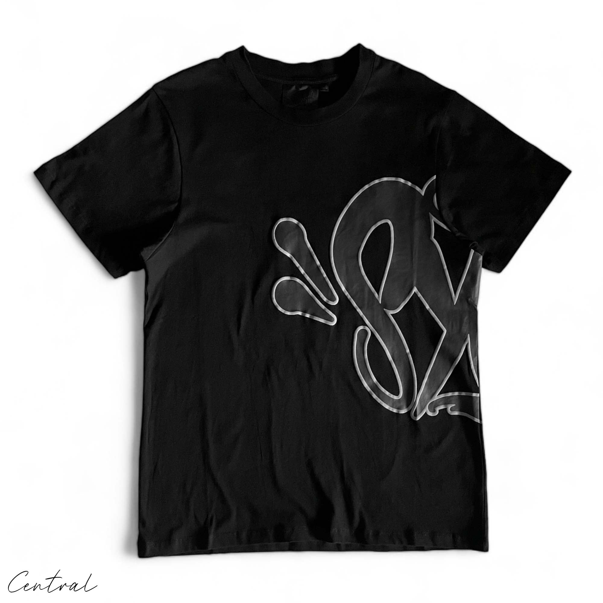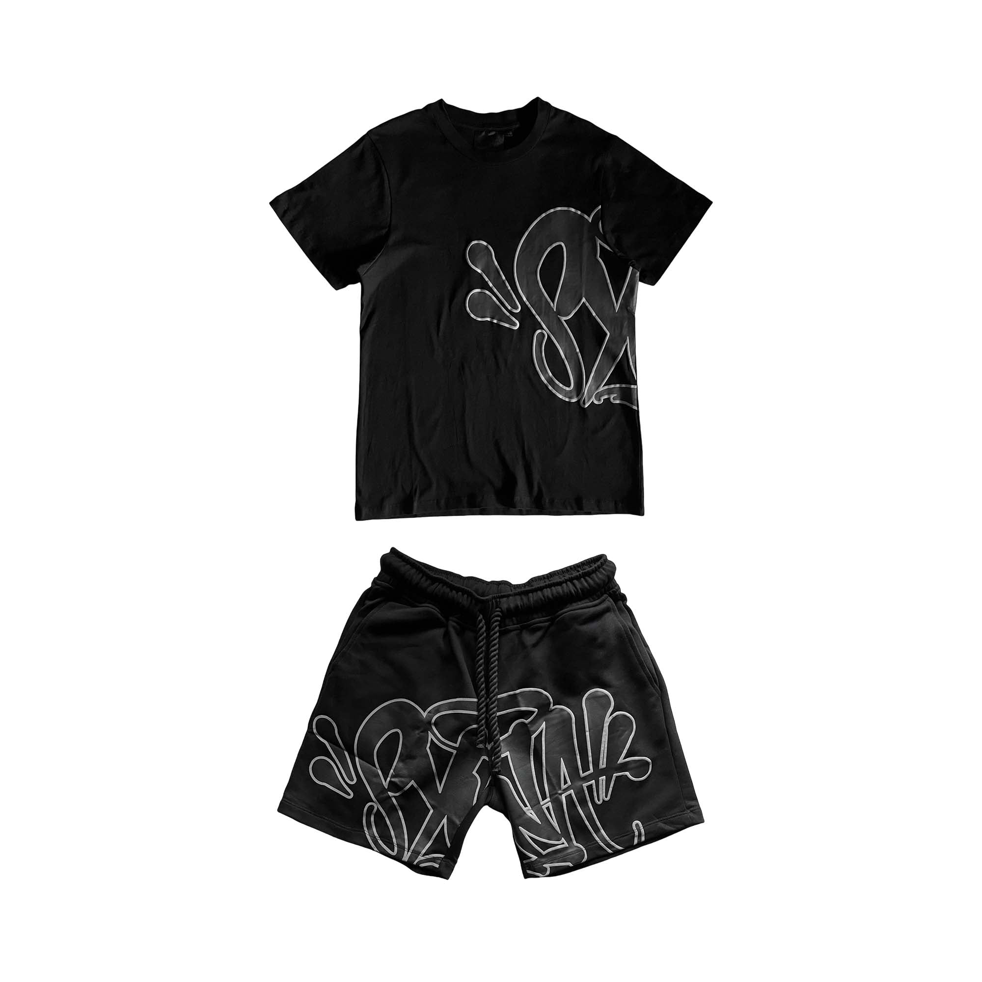 Black Syna World short set featuring a t-shirt and shorts by Central ae, laid out on a neutral background.